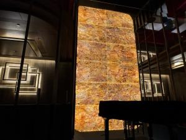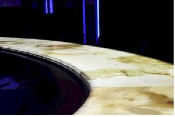 Lumiオニキスは、薄型自然石資材シートを独自技術でLED内蔵導光板に付着させユニット化した光る自然石です。薄型でありながら大判サイズ製作が可能なことで、カウンターや光り壁としてご使用いただけます。また、LED内蔵導光板の色温度や調光・調色で自然石の風合いの選択が広がることでさらなる光り演出が楽しめます。